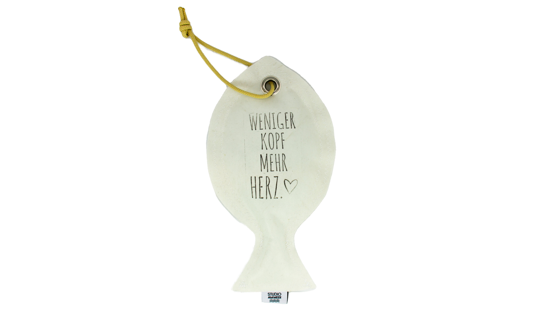 fischers fritz fischt frische Türanhänger in Form einer Scholle aus Segeltuch WENIGER KOPF MEHR HERZ z. B. für das Badezimmer, Strandkorb. Der Türanhänger aus gebrauchtem Segeltuch kann als fröhlicher Hinweis an jeder Tür genutzt werden. Inkl. einer praktischen Kordel zum Aufhängen